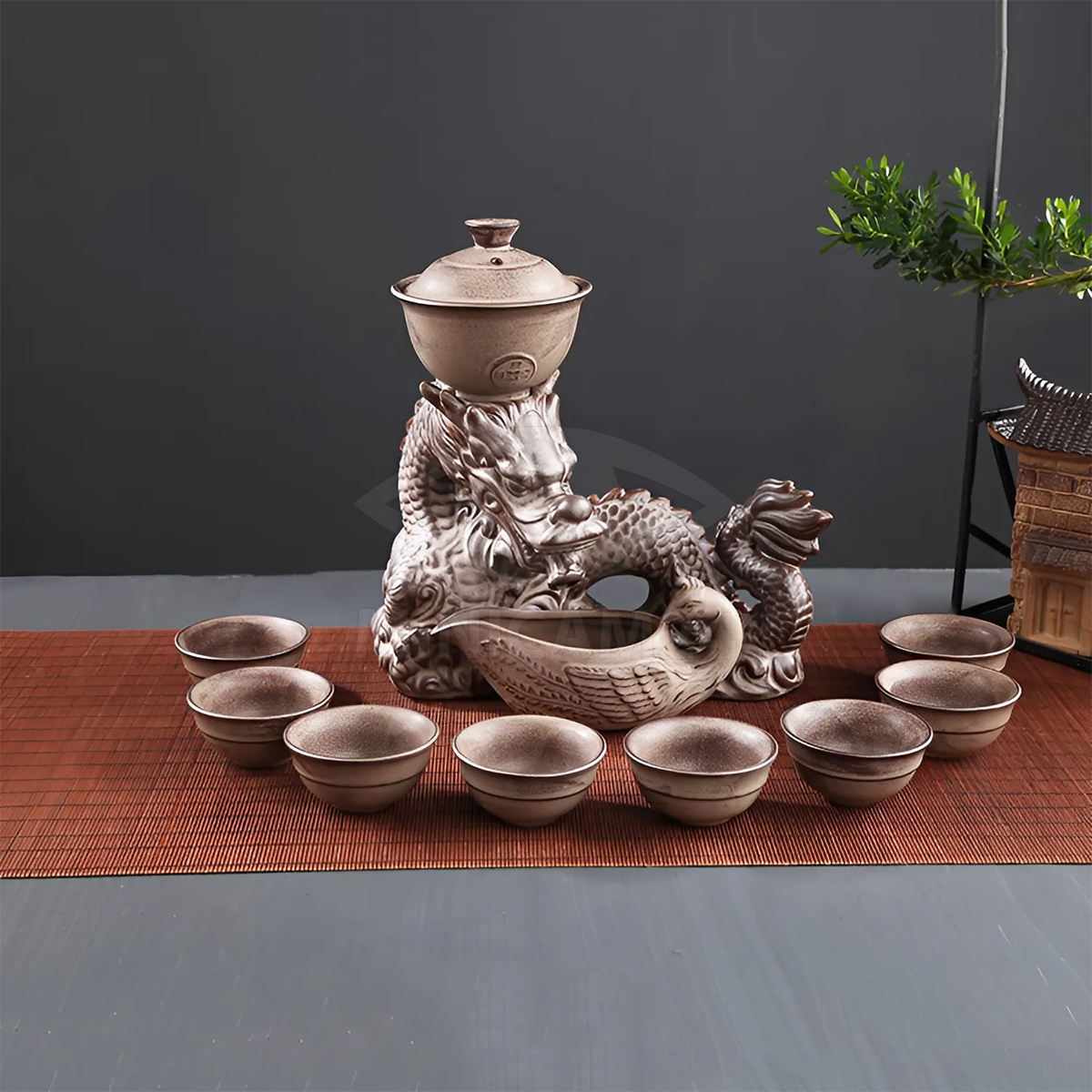 Дополнительно в комплект входит сливник для аккуратного переливания чая, а также подставка для гайвани. Набор Del Drago станет отличным подарком для любителей восточной чайной культуры и прекрасно впишется в интерьер благодаря изысканному керамическому исполнению.